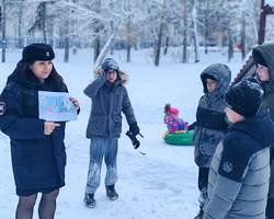 В ходе проведения акции госавтоинспектор объяснил детям правила безопасного катания на горках и напомнил, к чему может привести использование детских снежных горок вблизи проезжей части.