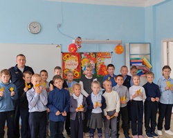 Госавтоинспекторы проверили наличие светоотражающих элементов на одежде учеников. У каждого ученика начальных классов на рюкзаке был светоотражающий брелок. После проверки наличия СВЭ полицейские наглядно показали, как работают светоотражающие элементы, каждому ребенку инспектор подарил по светоотражающей наклейке для того, чтобы они могли разместить ее на куртке и всегда, даже на прогулке были заметны водителям.